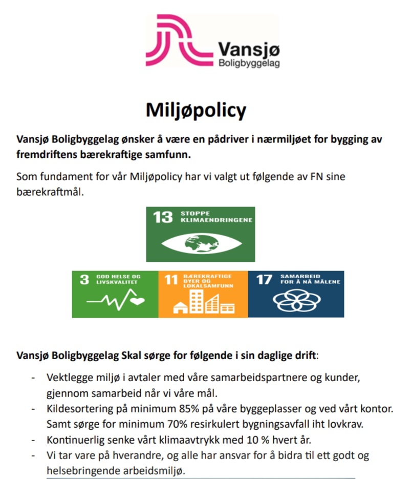 Miljøpolicy i VBBL VBBL ønsker å være en pådriver i nærmiljøet for bygging av fremdriftens bærekraftige samfunn mandag 10. april 2023 https://rapportering.miljofyrtarn.no/stats/162588